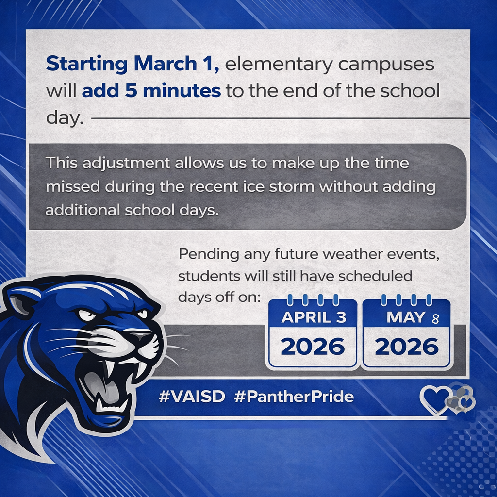 Starting March 1, elementary campuses will add 5 minutes to the end of the school day. This adjustment allows us to make up the time missed during the recent ice storm without adding additional school days. Pending any future weather events, students will still have scheduled days off on April 3, 2026, and May 8, 2026.